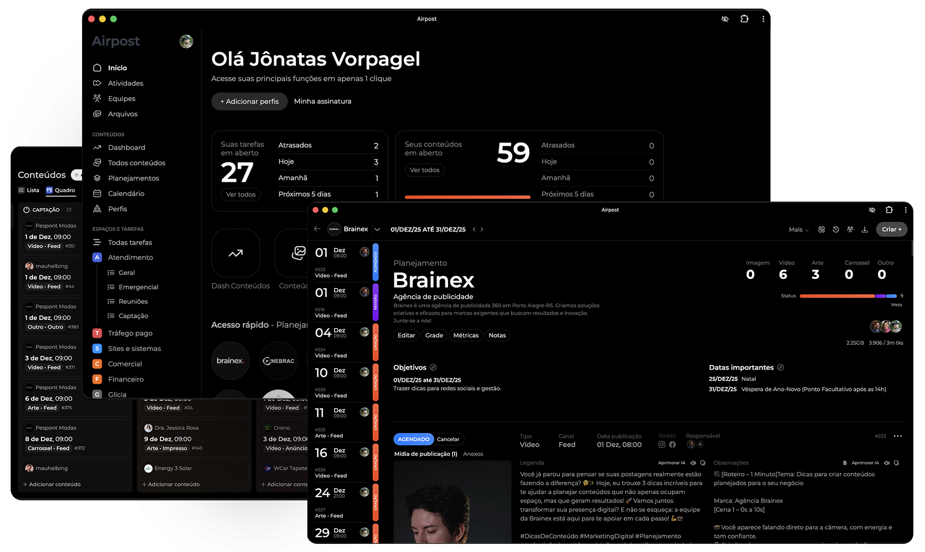 A dashboard da Airpost coloca você no comando da sua estratégia digital, oferecendo visão clara e em tempo real sobre tudo o que acontece na sua gestão de conteúdos.